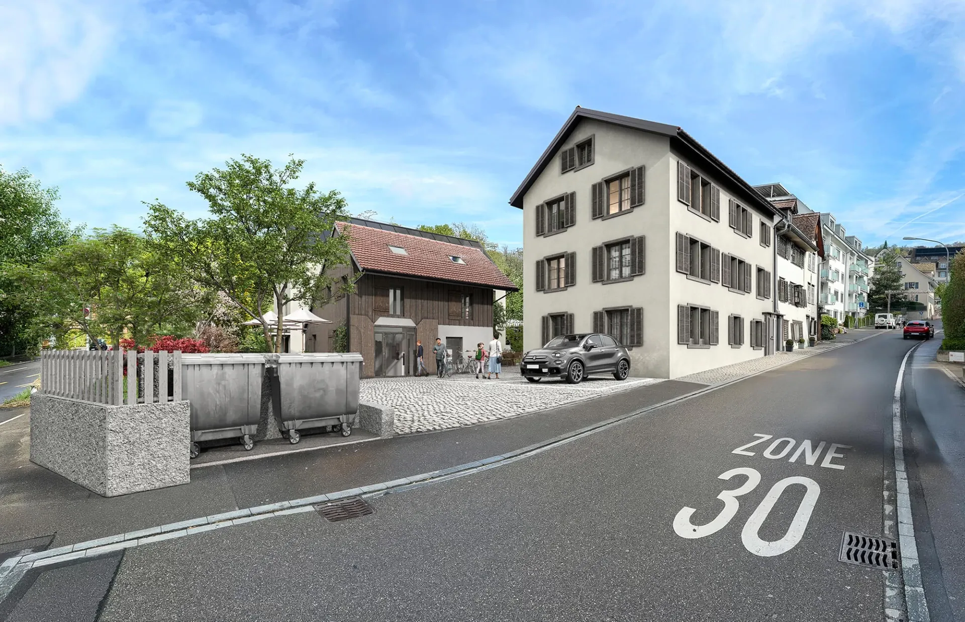 Final image compute (rendering) plus post-processing in Photoshop or After Effects — colour correction, staffage (people, plants), atmospheric details.
